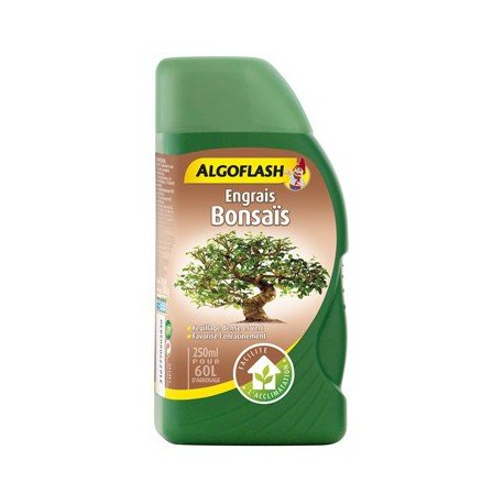 L’engrais spécial Bonsaïs Algoflash contient les éléments nutritifs (Azote, Phosphore, Potasse) et oligo-éléments indispensables à la nutrition et à l’acclimatisation de vos plantes. Spécialement formulé pour couvrir les besoins nutritionnels de toutes les espèces de Bonsaïs : Serissa, Araucaria, …il favorise la croissance d’un feuillage dense et vert, ainsi que le développement des racines.