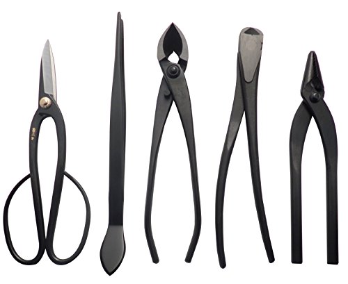 Set des 5 outils essentiels pour le soins du bonsai. Ciseaux 200 mm/140 g, Pince avec Spatule 220 mm/55 g, Pince 180 mm/170 g, Pince à Fil 210 mm/250 g,