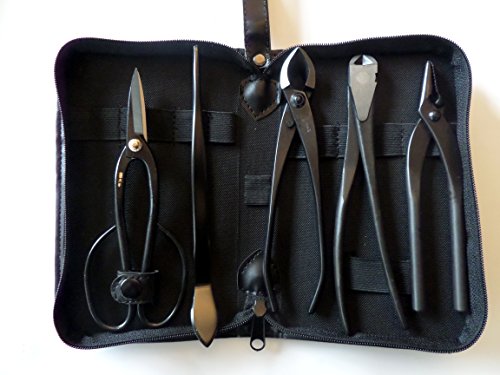 Set des 5 outils essentiels pour le soins du bonsai. Ciseaux 200 mm/140 g, Pince avec Spatule 220 mm/55 g, Pince 180 mm/170 g, Pince à Fil 210 mm/250 g, Pince à Branches 205 mm/190 g. Etui en cuir gratuit inclus. Produit original japonais