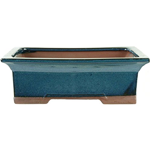 Pot à bonsaï (en grès émaillé, couleur sarcelle, rectangulaire) de dimensions extérieures: 28cm de long, 22.5cm de large, 9cm de haut. Bonne qualité standard typique de la ville chinoise de Yixing réputée pour sa production de poteries.